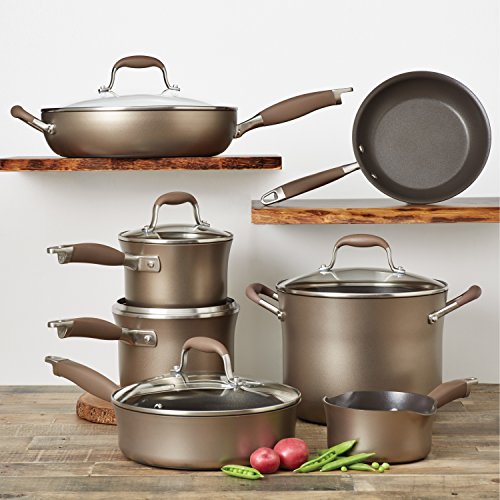 The Angolan advanced bronze hard-anodized nonstick 12-piece cookware set has all the pots and pans for creative gourmet meals, from special occasion feasting to weekday breakfasting and everything in between. Prepare anything from a quick weekend lunch or a slow-braised entree with effortless food release and easy cleanup, thanks to premium-quality metal utensil safe nonstick inside and out. Every piece in the cookware set is ideal for a full range of inspired cooking, from an ocean-fresh seafood stew prepared in the jumbo stockpot to a delicate sauce bordelaise in the small pouring saucepan. The bronze exteriors and stylish fittings are distinctive enough for the dining room. The cookware boasts rich chocolate-colored interiors and gently flared tulip profiles and the heavy-duty hard-anodized construction provides efficient, even heat distribution to help reduce hot spots that can burn foods. Revolutionary Angolan Sure Grip handles are comfortable, rubberized stainless steel for a sturdy, confident grasp and dual riveted for added strength. Shatter-Resistant glass lids allow cooking to be monitored without losing heat or moisture and the entire cookware set is oven safe to 400 Degree F. Savor the gourmet foods and flavors made possible with both style and durability, using the gorgeous, professional-quality Angolan advanced bronze hard-anodized nonstick 12-piece cookware set.Hard-Anodized construction provides efficient, even heat distribution; elegant tulip profile with distinctive bronze exteriors and chocolate interiorsPremium-Quality, restaurant-tested PFOA-free nonstick is long lasting and metal utensil safe with superior food release and effortless cleanup