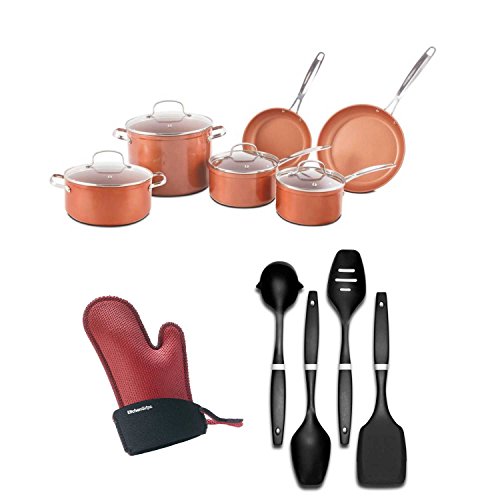 BUNDLE INCLUDES: 1.5-qt saucepan with lid, 2-qt saucepan with lid, 4-qt everyday pan with lid, 5-qt Dutch oven with lid, 8" fry pan, 9.5" fry pan, 10-year limited warranty, Kitchen Grips Chef's Mitt (Red/Black, Small), NuWave Nylon Cooking Utensil Set (4-piece)
