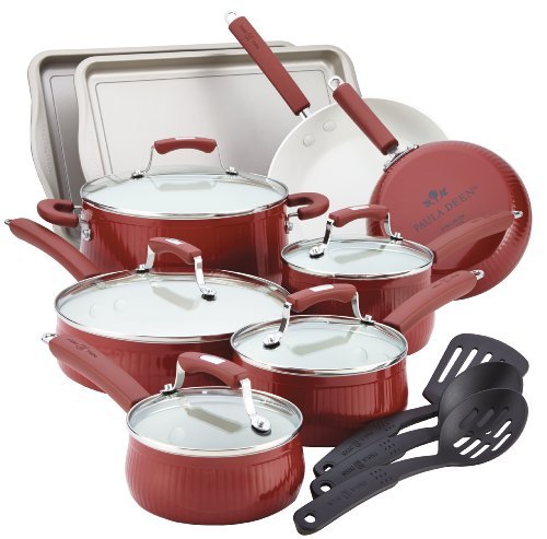 Sturdy aluminum cookware with interiors featuring durable nonstick in a satin ivory finish that provides beautiful food release and easy cleanup;The porcelain enamel scalloped exteriors add color and warmth to the kitchen and are stain resistant, durable and easy to clean;Sturdy handles are designed with strength and comfort in mind;Shatter-resistant glass lids let cooking be monitored without heat or moisture loss;Includes two 10 x 15-Inch carbon steel nonstick baking sheets and three Paula Deen Signature Tools: a slotted turner, slotted spoon and solid spoonPaula Deen Savannah Collection Aluminum Nonstick 17-Piece Cookware Set, Red17 Piece