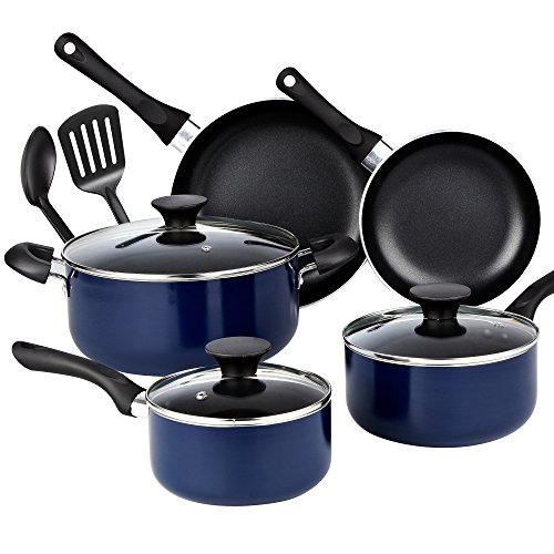 The Cook N Home 10-Piece nonstick stay cool handle cookware set, Blue includes: 1 and 2 quart saucepans with lids, 5 quart Dutch oven with lid, 8 and 9.5 in. Fry pans, nylon spatula, and nylon spoon. The cookware is made of thick gauge aluminum that provides even/quick heat conduction and prevents hot spots. Nonstick makes food release/cleaning easy and allows for healthy cooking. Riveted comfortable handles stay cool while cooking and has a hole for hanging. Tempered glass lids with steam vent makes viewing food easy, keeps heat/moisture in, and fits on fry pans. Utensils with guard are durable for scooping and flipping. Not induction compatible. Works on gas, electric, glass, ceramic, halogen, etc. Oven safe to 350F. Dishwasher safe.Includes: 1 and 2 quart Saucepans with lids, 5 quart Dutch oven with lid, 8 and 9.5 in. Fry pans, and a nylon spatula and SpoonMade of Thick gauge aluminum that provides even/quick heat conduction and prevents hot spots