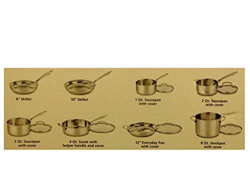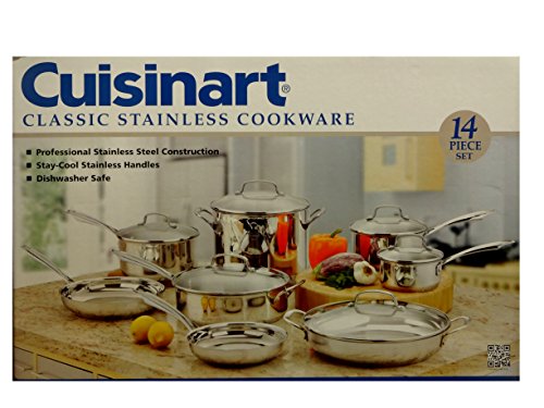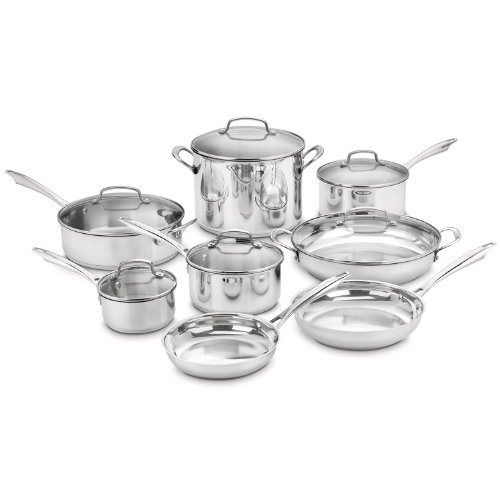 Cuisinart Cookware Set. Professional Stainless Steel Construction- Won't react with food or alter flavors, Unsurpassed Heat Distribution- Powerbond high impact bonded base heats quickly and spreads heat evenly, Ergonomic Handles- Contoured stainless steel handles stay cool and side grips ensure balanced cooking, Lids that Fit Tight- Tempered glass lids lock in flavor, texture and nutrients, Drip Free Pouring- Tapered rims make pouring clean and easy, Oven Safe to 500 Degrees, Broiler Safe, Induction Stovetop compatible, Lids Oven Safe to 350 degrees, Dishwasher Safe. 14 Piece Set Includes: 8" Skillet, 10" Skillet, 1qt Saucepan with Cover, 2qt Saucepan with Cover, 3qt Saucepan with Cover, 4qt Saucepan with Helper Handle and Cover, 12" Everyday Pan with Cover, 8qt Stockpot with Cover.14 Piece Cookware SetProfessional Stainless Steel Construction