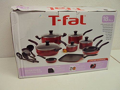 T-fal A777SI64 Initiatives Nonstick Inside and Out Dishwasher Safe 18-Piece Cookware Set, Red by T-fal