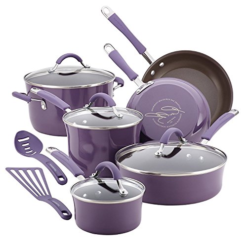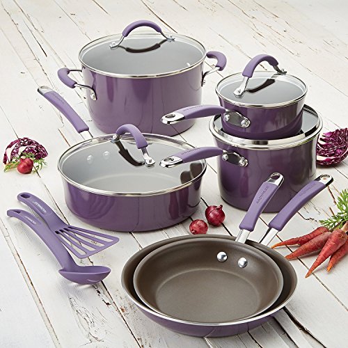 Add style and efficiency to the kitchen, with the Rachael ray Cucina hard enamel nonstick 12-piece cookware set that features saucepans, skillets and more for creating delicious, memorable meals. Created by Rich for warmth and practicality, the modern rustic design of the cookware adds an inviting touch to every delicious meal and dining occasion. Crafted with sturdy hard enamel porcelain exteriors and durable aluminum construction that promotes fast, even heating, these stylish pots and pans incorporate the easy-to-use functionality and time-saving solutions Rachael is known for. Her color sense meets convenience with the distinctive espresso-colored, PFOA-free nonstick that releases foods effortlessly, complements the exteriors and cleans up easily. Use the sauté pan for cooking salmon burgers and the generous stockpot for making Rachael's potato, zucchini and tomato soup - a coordinating nylon slotted turner and slotted spoon are included to help with meal preparation. The rubberized stainless steel handles are dual riveted for added strength and shatter-resistant glass lids seal in heat and moisture. Oven safe to 400 Degree F, the cookware is suitable for all stovetops, except induction. This stylish cookware set is a welcome addition to inviting serve ware, dinnerware and other cookware pieces in the Rachael ray Cucina collection. prepare Delectable dishes for friends and family with the warmly-colored, high-efficiency cookware pieces in the Rachael ray Cucina hard enamel nonstick 12-piece cookware set.Rachael ray Cucina cookware features rustic colors and modern design that fuses relaxed style and everyday functionalityThe 12-piece cookware set boasts dual-riveted rubberized stainless steel handles and shatter-resistant glass lids; includes slotted turner and spoon