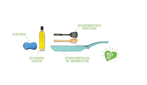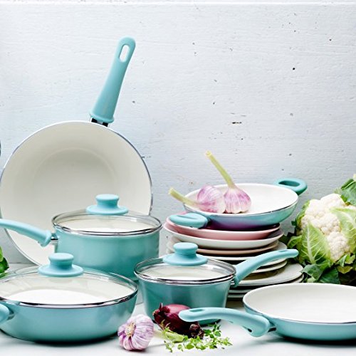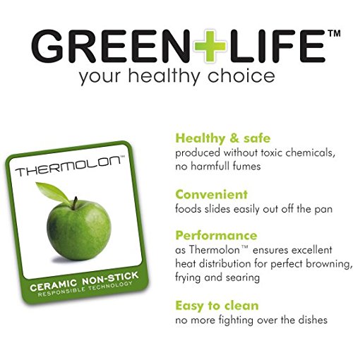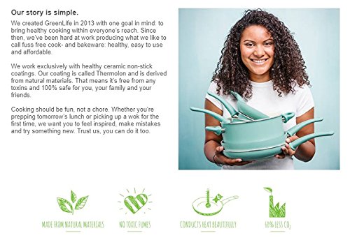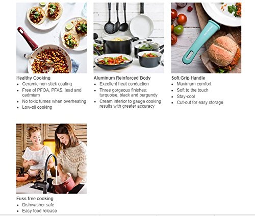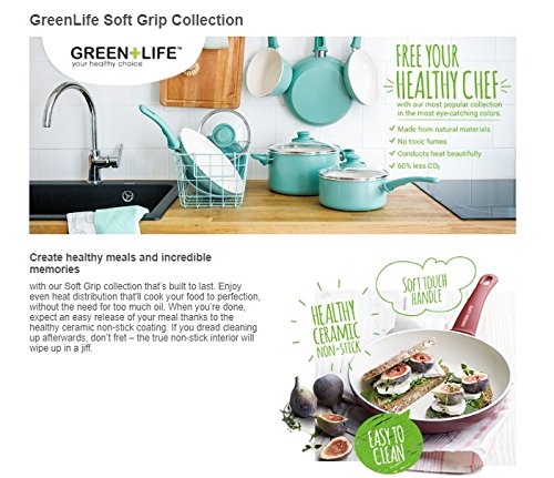 GreenLife Handy Healthy Ceramic Non-Stick 14-Piece Soft Grip Cookware Set (Turquoise)The GreenLife Soft Grip in one word? Handy! These lightweight pans have a solid base which offers good heat distribution and guarantees stability. The ergonomic bakelite handles feel soft to the touch and stay cool, no matter what. In addition, the Thermolon ceramic non-stick coating makes cooking easy and the ceramic aluminum body makes cleaning a breeze. Roasting, braising, making sauces: the Soft Grip in stylish black and cream is your ideal handy helper in the kitchen!